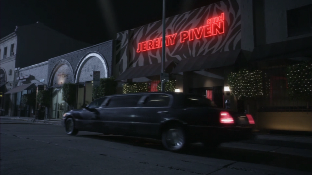The club is a reference to the opening titles of TV series Entourage which credited the cast by displaying their names in neon signage on different buildings ending with "and Jeremy Piven". Entourage is parodied in "Colony Collapse".