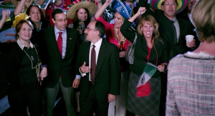 Lindsay and The crowd at Cinco de Cuatro chant the words "put up this wall, put up this wall" ("Red Hairing")