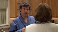 "Michael Bluth got up early in the hopes of avoiding his family. His mother, however, was already dressed, made up and waiting for him. Which put her wake-up time in the 3:00, 3:30 area." Lucille always has trouble sleeping this time of year because she gets excited before Motherboy, a dinner dance aimed at promoting mother/son bonding. Lucille has gone with Buster over 25 times, and on several occasions they have won "Cutest Couple". But for Motherboy XXX, Lucille wants to take Michael, because Buster has become moody after losing his hand. Michael chides his mother for not being there for Buster the one time that he finally needed her. Lindsay is also up early, upset that Tobias has re-connected with acting coach Carl Weathers. Tobias is excited about a possible role in Carl Weathers' latest television project, but Lindsay complains that Tobias always blows these chances and that he's not a take-charge husband. Up in the attic, George Sr. has to hide when Maeby and George Michael come up looking for camping gear for George Michael's upcoming Christian camping trip with Ann. Michael later catches news of the trip from George Sr., who overhears everything while hiding.