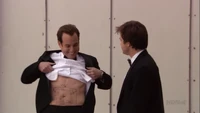 And the guys arrived at the prison to stage their break in. G.O.B. donned George Michael's jet pack, but forgot to strap it on. As a backup plan, he had drawn the prison blueprints on his stomach. Upside down. To read them, G.O.B. had to lie on the ground so Michael could straddle him in a very compromising position. A prison guard found them, but thought they were part of the gala and ordered them inside.