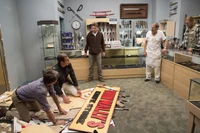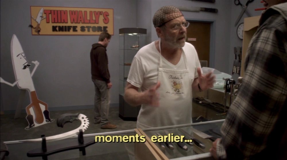 Gene Parmesan buys a knife at Thin Wally's Knife Store that can "both filet a chicken and subdue an intruder." While wrestling at My Little Ballroom G.O.B. and Michael crash through the wall into the knife store. ("A New Attitude")
